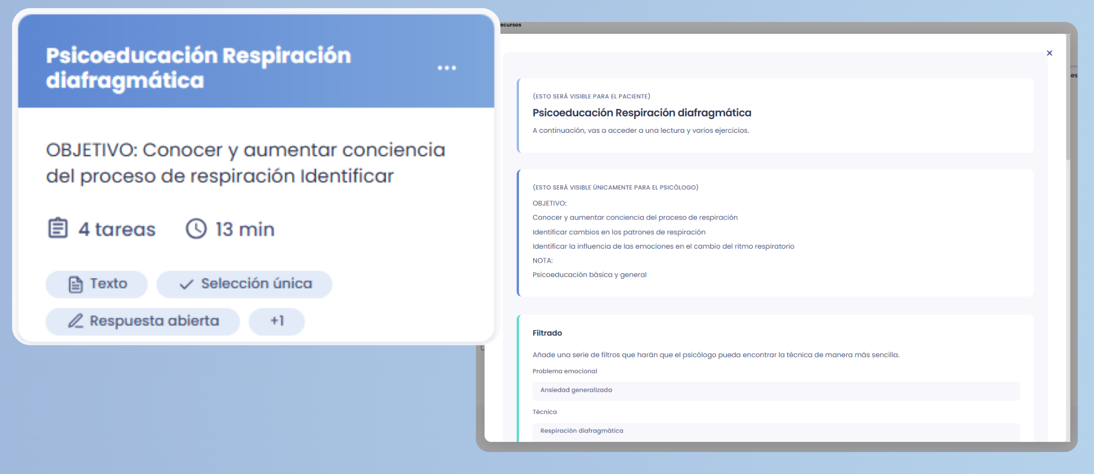 Desde la sección “Mis recursos” o directamente al finalizar la sesión en “Mis pacientes”, puedes enviar prácticas adaptadas a cada caso, como: