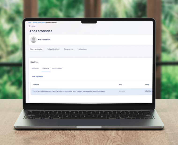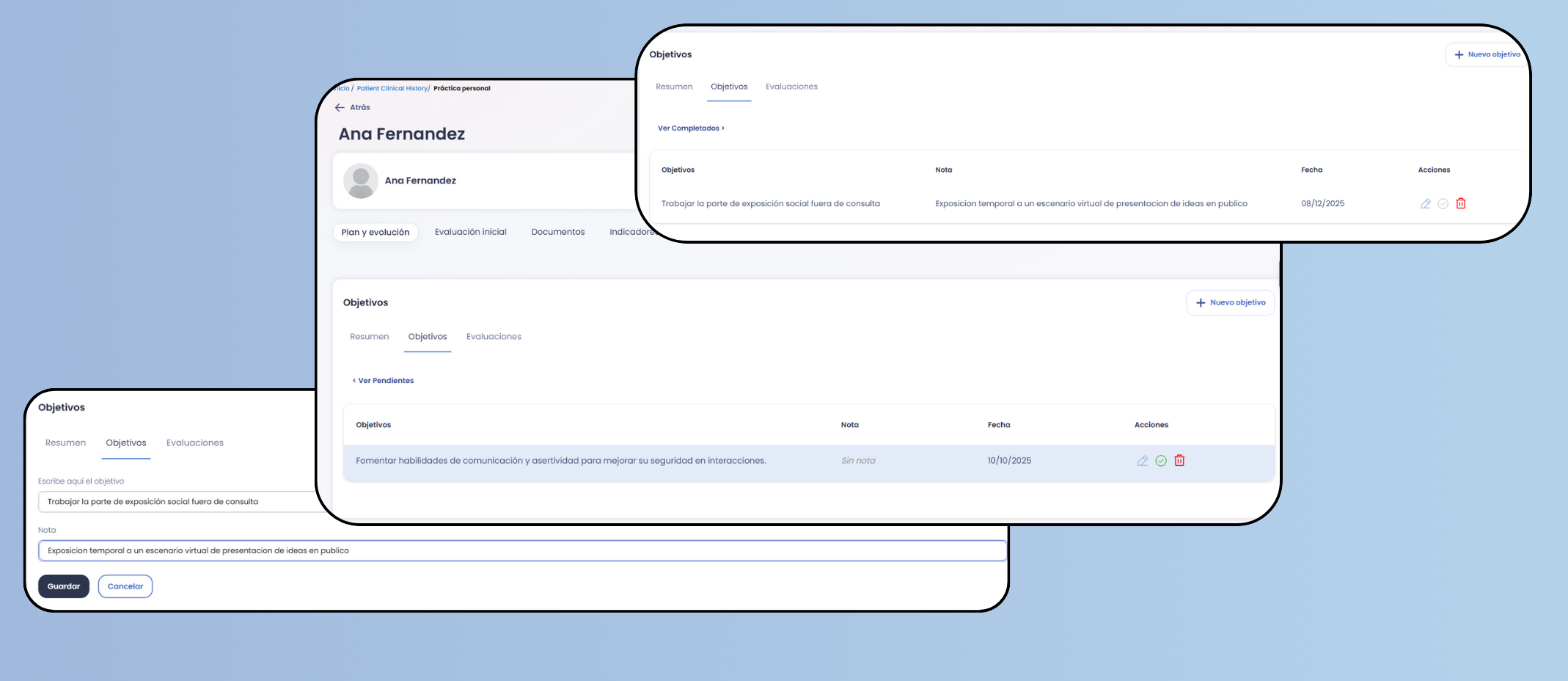 Si uno de los objetivos es que el paciente hable con un familiar con quien tiene un conflicto, puedes registrarlo, seguir los intentos, complementarlo con ejercicios de afrontamiento y revisar los avances juntos. Cada paso queda documentado y visible.